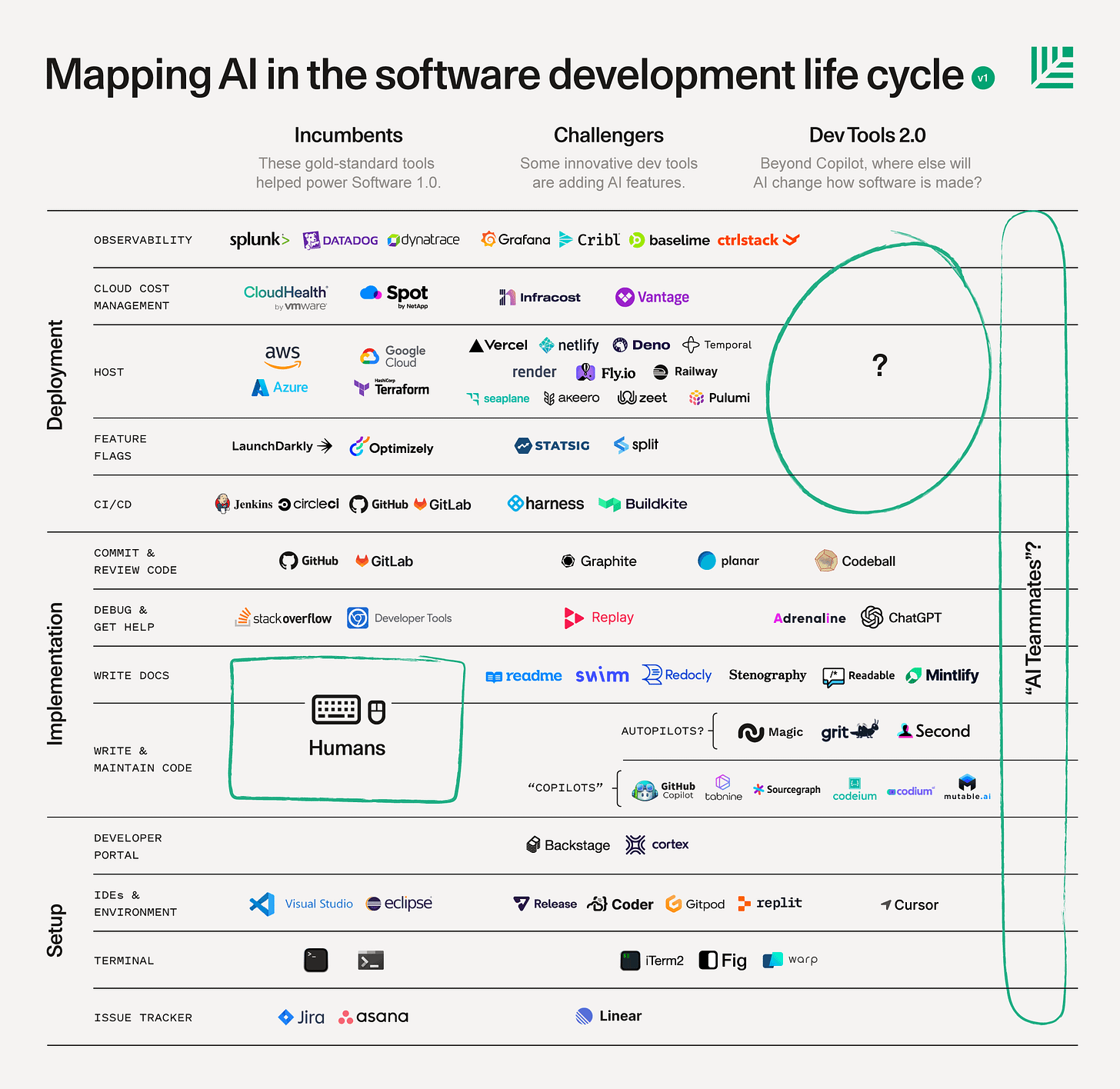 這大圖洋洋灑灑地把 SDLC (Software Development Lifecycle, 軟體開發生命週期) 攤開,左邊是現任者 (incumbent),中間是挑戰者 (challenger),右邊再畫了一個大空白圈圈留給 AI 時代帶來的開發工具 2.0 無限想像空間。